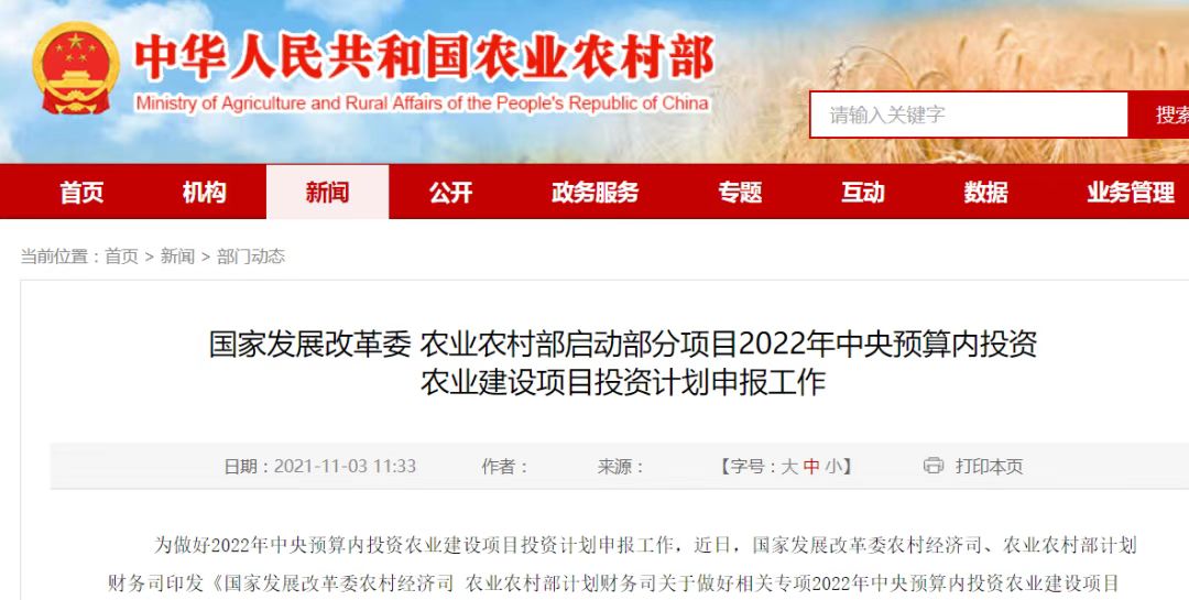 《通知》還明確,各地要結(jié)合本地財(cái)政承受能力和政府投資能力合理申報(bào)中央預(yù)算內(nèi)投資計(jì)劃,于2021年12月10日前將投資計(jì)劃申報(bào)文件聯(lián)合報(bào)送至國家發(fā)展改革委、農(nóng)業(yè)農(nóng)村部。
